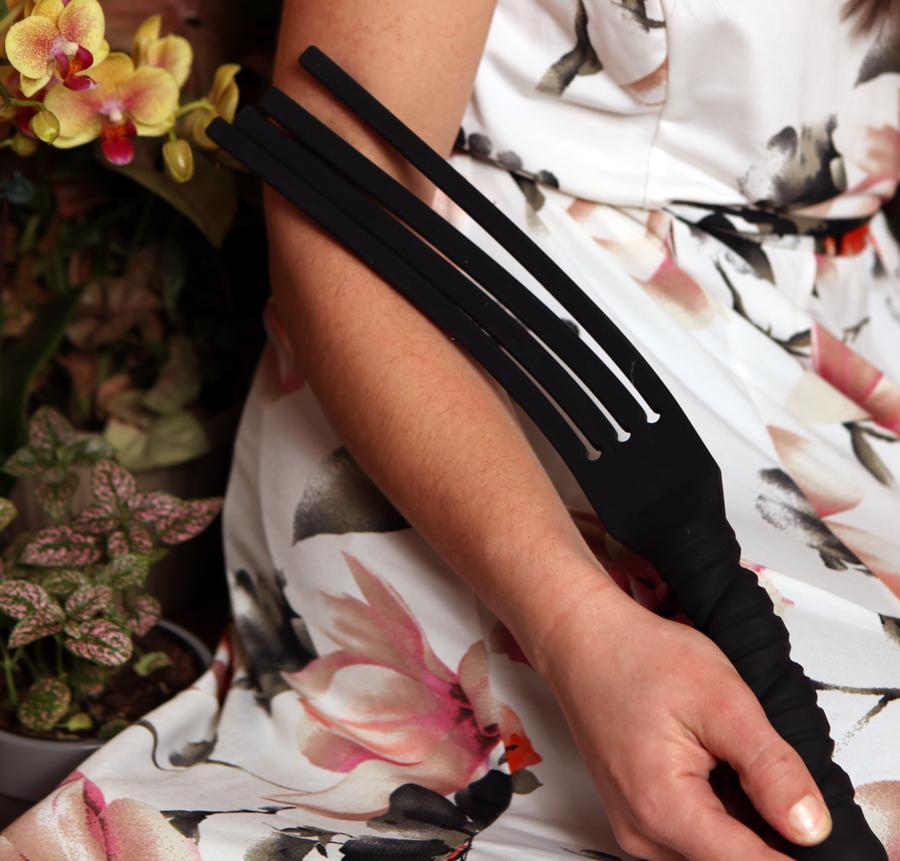Tawses (pronounced taws) were used as corporal punishment in public schools in Scotland until 1987. The impact of the standard leather tawse can be very intense; even more so in Tantus Silicone. Tawse It Overboard features four tongues, each 3/8” thick, 8.5 inches in length. The density is intense. Because it’s Tantus Silicone, it transmits energy very effectively and takes very little in terms of strike force. The handle (1.5 inches by 6 inches) is very effective for blunt impact play and as a potential heavily textured dildo for internal use. And, because the Tawse It Overboard is made from Tantus Silicone you can thoroughly cleanse the toy. With a little care, Tawse It Overboard will last a lifetime.